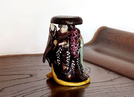 歌舞伎の演目のひとつ「藤娘」をイメージして作られた茶道具の蓋置。映画「国宝」にも登場する演目のひとつ。丁寧に作り込まれ藤の花の精の妖艶な雰囲気に「長唄」が聞こえてきそうです。 参考作品(非売品)