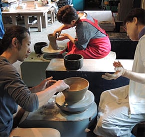 陶郷の教室は段階に合わせた個人指導。初めての方は基本から(土練り、手びねり等)、粘土に慣れてきたら電動ロクロ、大きな作品にと制作内容も大きく制限をしませんので本人が作りたいと思う作品が作れる環境を整えています。見学自由。お気軽に教室をのぞきに来てください。